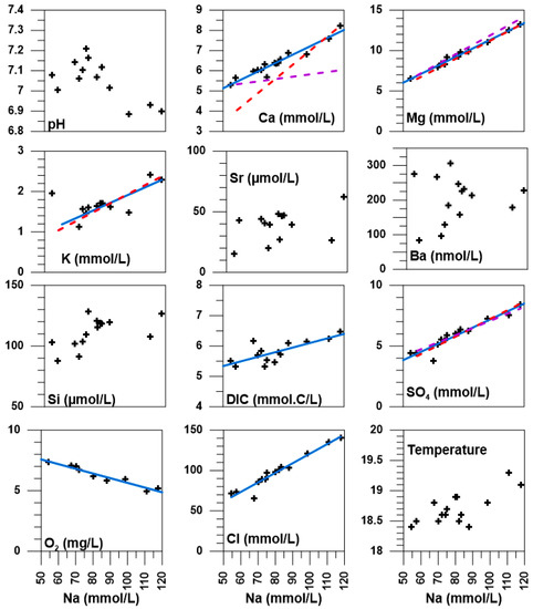 Parameters measured in situ (salinity, pH, temperature, dissolved oxygen) and element concentrations versus the Na content of the karstic spring waters. The blue solid lines are linear fits to the data meant to outline the trends. The red dashed lines are calculated for the case where the highest salinity spring water (salinity 9.4) is diluted by freshwater infiltration. The purple dashed lines represent the variation of the element concentrations when modern seawater (salinity 38 for the Mediterranean Sea) contaminates the spring water with the lowest salinity (salinity 4.7).