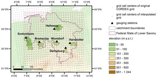 Grid cell centers of the original Coordinated Downscaling Experiment for Europe (CORDEX) grid, the interpolated 10 × 10 km grid and the location of the six catchments.