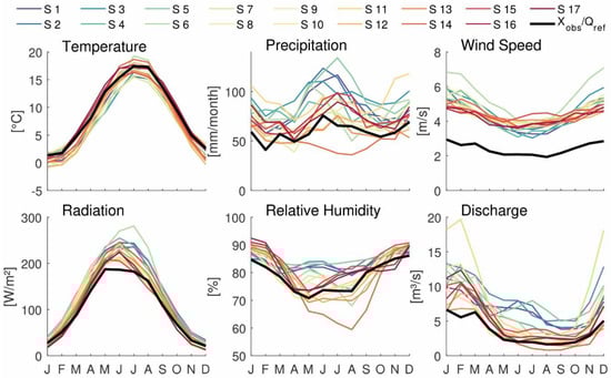The long-term monthly mean values of the climate variables Xobs and Xhist,orig and discharge Qref and Qhist,orig are displayed in Figure 2 for the catchment Wunstorf. Generally, the seasonality of simulated and observed climate variables shows a good agreement, whereby the absolute values often show large deviations. Discharge is overestimated by most scenarios for most of the year. S10 shows high positive deviations of up to 300% in winter. The analyses of monthly data for the other five catchments led to similar results. Overestimations of discharge in such magnitudes may indicate hydrological characteristics of a catchment that are very different from realistic conditions.