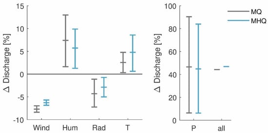 The sensitivity analysis was carried out for all climatological variables that were used as input for the hydrological model. The results are shown in Figure 3. The influence of the climate variables on the simulation of the hydrological parameters MQ and MHQ is similar. The applied alterations of precipitation have the greatest influence on the simulated discharge. However, the other variables have an influence on the hydrological simulations that should not be neglected. The deviation of discharge when changing all variables simultaneously is comparable to that of changing precipitation only. First of all, this can be explained by the by far greatest influence of precipitation. But secondly, the deviations of the other climate variables may have opposing effects on discharge and, therefore, they might neutralize each other to a certain extent. The overestimation of radiation and wind speed, for example, leads to an underestimation of discharge, while the overestimation of humidity leads to more discharge.