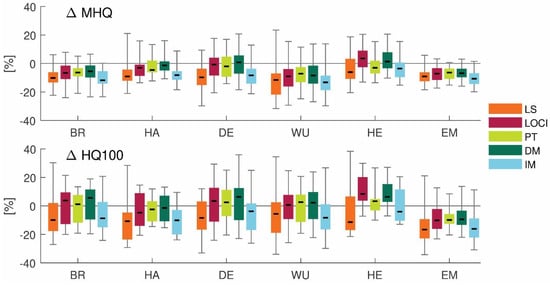 Percentage deviations for MHQ and HQ100 between the simulations with bias corrected climate scenario data and observed climate data for the historical period 1971–2000 for six catchments (Bramsche-BR, Harxbuettel-HA, Derneburg-DE, Wunstorf-WU, Hellwege-HE and Emlichheim-EM) applying different bias-correction (BC) methods (linear scaling (LS), local intensity scaling (LOCI), power transformation (PT), distribution mapping (DM) and Inter-Sectoral Impact-Model Intercomparison Project (ISI-MIP) approach (IM)) for precipitation and linear scaling for the other climate variables.