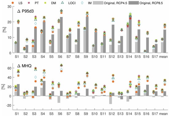 Climate change signals for P95d3 and MHQ for 17 climate scenarios for the non-corrected climate scenario data and differently bias-corrected data as mean of the grid cells for the whole area (P95d3) or as weighted mean by catchment size (MHQ) for the period 2070–2099 compared to the historical period 1971–2000. The correction methods are: linear scaling (LS), power transformation (PT), distribution mapping (DM), LOCI and the ISI-MIP approach (IM).