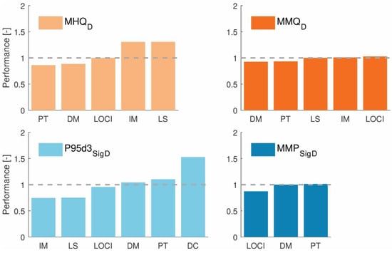 For the evaluation of MMPSigD, the methods delta change, linear scaling and ISI-MIP are not included, because of the perfect agreement with the signal obtained from non-bias-corrected data (see Section 3.5). LOCI performs better than distribution mapping and power transformation. For P95d3SidD, the performance of the ISI-MIP approach and linear scaling is significantly better than the other methods, whereas delta change shows a much lower performance.
