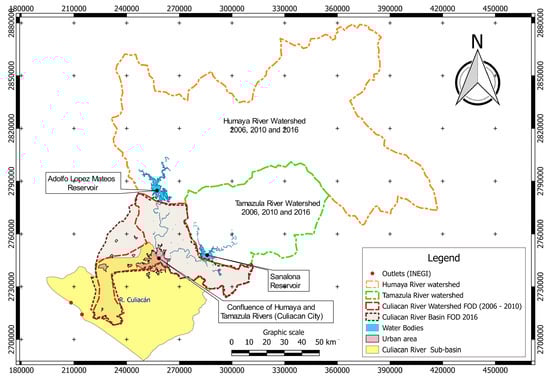 Despite the study area defined by INEGI (Instituto Nacional de Estadística e Informática) being based on natural hydrologic division, the National Water Commission [] established in 2016 a delineation based on three drainage basins (Humaya River, Tamazula River, and Culiacan River basins) that does not correspond to the INEGI delineation (Figure 1). In CONAGUA’s delineation, the Humaya River Basin does not coincide with that proposed by INEGI. The official delineation (CONAGUA) includes part of the Humaya River Basin up to Adolfo Lopez Mateos Reservoir. The same situation is observed for the Tamazula River Basin, where the official delineation partially encompasses this basin up to Sanalona Reservoir. Then, based on the CONAGUA delineation, the Culiacan River Basin initiates at the Adolfo Lopez Mateos and Sanalona reservoirs and ends in their outlets to the sea.
