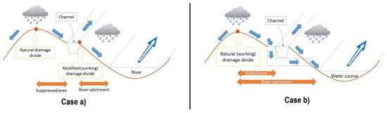 Upstream, where agricultural infrastructure becomes relevant, the drainage channel influence was considered. These channels were built in swathes of territory of relatively high elevations with respect to areas along the rivers. Therefore, they collect water that originally flowed to the main watershed channel (river). This situation defined the proposed watershed divide, which is physically pertinent in the study area. The initial drainage divide was proposed by a boundary line that followed the agricultural drainage channels’ borders. This situation implied that the natural (topographic) catchment area was suppressed due to the presence of this infrastructure. This situation is explained in Case a shown in Figure 3.