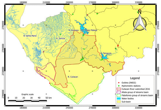 Culiacan River Watershed and Pericos River Basin according to INEGI (2017a); “Pabellones Group of Streams” and “Altata Group of Streams” basins according to CONAGUA (2016a); hydrometric stations and drainage sites obtained from CONAGUA (2017a).