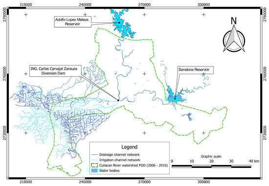Culiacan River watersheds published by CONAGUA (2016a) in 2006 and 2010; hydrography of the study area (INEGI, 2017a) and drainage channel networks of Irrigation District 010 Culiacan Humaya (CONAGUA, 2017b).