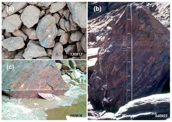Some features to determine the presence of water-bodies and their depth. (a) Rocky bottom coated with a fine film of sediment. By contrast, the coin is on an uncoated stone. (b) “Palaeo-levels” preserved in a block on the edge of Laguna de Vacares (height: 2880 m a.s.l.). Numbers of the bar near the measuring tape show depths every half meter. Lines between 1.5 and 2.5 m indicate the “palaeo-levels” identified. (c) Similar to the previous in an unnamed pond found in the Lanjarón river catchment (height: 2953 m a.s.l.). In this case we have only observed one “paleo-level” clearly marked. Numbers in lower right corner indicate the date of each photograph (year, month, day).