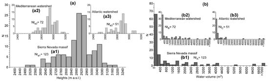 (a) Histogram showing the number of water-bodies distribution (N) by height (m a.s.l.) at 40 m intervals: (a1) throughout the entire Sierra Nevada. (a2) Idem on the Mediterranean watershed. (a3) Idem on the Atlantic watershed. Nt = total number of water-bodies. (b) Histogram showing the skewed distribution of water volumes (m3) at intervals of 200 m3: (b1) throughout the Sierra Nevada massif. (b2) Idem on the Mediterranean watershed. (b3) Idem on the Atlantic watershed. Nt = total number of water-bodies.