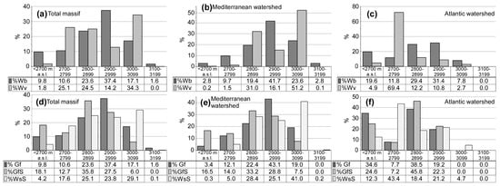 Upper file: relationships between water-bodies and water volumes between 2700 and 3200 m a.s.l. (at 100 m intervals) regarding: (a) total massif; (b) Mediterranean watershed; (c) Atlantic watershed. Abbreviations: %Wb = percentage of water-bodies; %Wv = percentage of water volumes. Lower file: relationships between green fringes (both the number of cases and their surfaces) and associated water-bodies between 2700 and 3200 m a.s.l. (100 m intervals) regarding: (d) total massif; (e) Mediterranean watershed; (f) Atlantic watershed. Abbreviations: %Gf = percentage of number of green fringes; %GfS = percentage of green fringes (surface area); %WsS = percentage of water-sheet (surface area).
