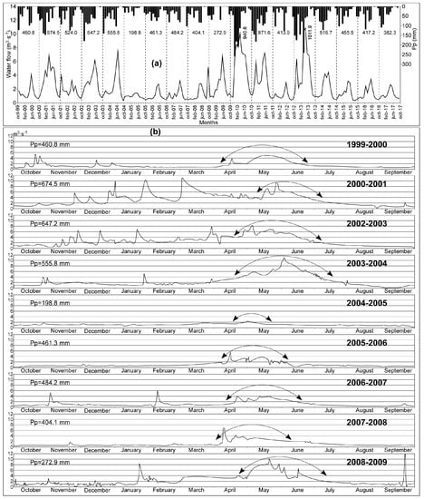 (a) Monthly evolution of rainfall (bars) and water-flow (continuous line) during the period 1999–2017 for the Canales hydrological station (Genil River, Atlantic watershed). Annual precipitations are indicated by the numbers between dashed lines. (b) Hydrograms for the Canales hydrological station (1999–2009) obtained from hourly data. Arrows highlight the moment of maximum snowmelt discharge. Numbers on left indicate precipitation (Pp) in the hydrological year.