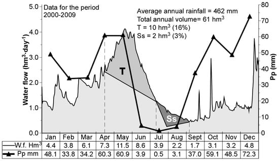 Mean hydrogram for 2000–2009 for the head of the Genil River showing daily water-flow (fine line) re-calculated as hm3 in each month (underlying table), and precipitation (thick line with filled triangles). T = Thaw contribution; Ss = Sub-surface contribution.
