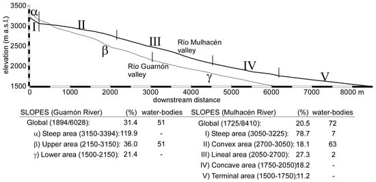 Geomorphological cross-section of two representative valleys of Sierra Nevada: Mulhacén River (Mediterranean watershed; slope stretches indicated by Roman numbers) and Guarnón River (Atlantic watershed; slope stretches indicated by Greek letters). The number (N) of water-bodies in each stretch is also indicated. Numbers in brackets (adjoining tables) indicate: for the global slope, the quotient between altitude/length; for other areas, range of altitudes in which the slope is defined. Vertical scale = Horizontal scale.