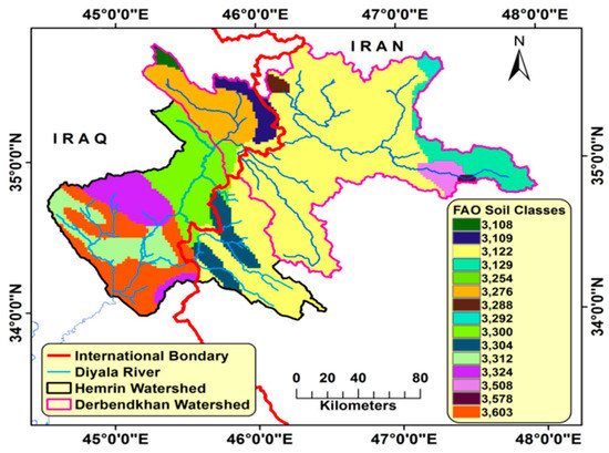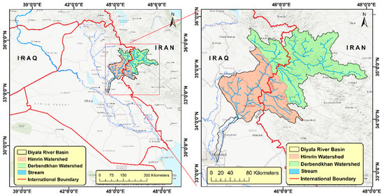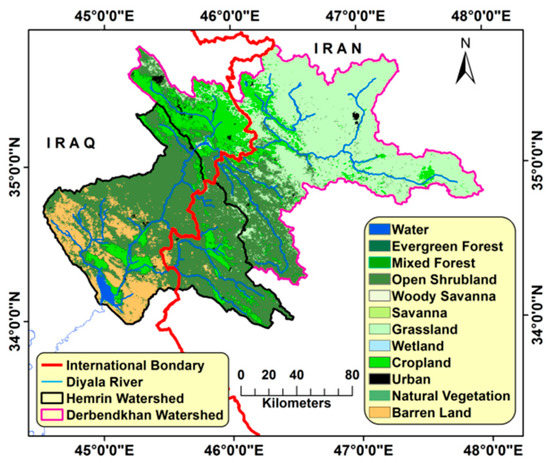 Climate change is reflected in the characteristics of watershed hydrology, such as streamflow and sediment yield, and can manifest as a long period of drought followed by extensive flooding over a short time period [2]. In the upper Tigris River in Turkey, precipitation will decrease under the impact of climate change to 12.5% by 2021 and 26% by 2030 [3]. In addition, the runoff will decrease to 30% after 2040. In recent decades, Iraq has experienced serious problems in its water resource sector, including water resource reductions, pollution, and desertification [4]. Iraq is located in a semiarid region of the Middle East, and during the last few decades it has faced extreme climate events. For example, a severe drought from 2007 to 2009 was followed by extreme rainfall that occurred over the course of a few months in southern parts of Iraq, with approximately two times the normal amount [5]. A geographic information system (GIS) was used to assess the impact of climate change in Iraq and Jordan [6]. This study indicated that the climate will be drier, natural land cover will be poorer, water resources will decrease, and temperatures will be higher. The Diyala River is one of the most important tributaries of the Tigris River, but its water resources suffer from scarcity and an increase in the sediment rate. The main purposes of water use in the Diyala River are agricultural, drinking, and industrial. In the Tigris River Basin and the Diyala River, water resource deterioration is indicated, and severe shortages in all water resources are expected, especially in the streamflow, for the future [7,8]. However, a comprehensive understanding of the impact of climate change on the water resources of the Diyala River is needed [9]. Considering the rapid decrease in the Dokan Dam’s reservoir capacity (near the Derbendkhan Reservoir), it was concluded that the sediment is the main problem facing this reservoir [10]. An investigation of the negative effects of sedimentation in the Mosul Dam’s reservoir showed that sediment plays an important role in the reservoir capacity and usually blocks the intakes of the pump stations [11]. The spatial and temporal distributions of streamflow and sediment yield depend on characteristics of rainfall such as the intensity and duration, topography, land cover, and soil type of the watershed [12]. A lack of effective land cover to catch the surface soil allows surface runoff to erode the surface soil, which is considered to be an unacceptable phenomenon for reservoir operation. Land cover management is a traditional method to reduce the sediment yield of a watershed [13].