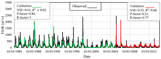 According to Moriasi et al. (2007) [28], if the NSE is greater than 0.5, the simulation is satisfactory, while a good simulation should have an NSE greater than 0.75. Consequently, the calibrated and validated streamflow, the accepted SWAT model, of the Derbendkhan Watershed with daily-based NSE, , P-factor, and R-factor for calibration (validation) of 0.61 (0.53), 0.62 (0.68), 0.84 (0.21), and 1.00 (0.77), respectively, is shown in Figure 6. For both models, the results of calibration and validation were considered acceptable simulations. Also, for the Hemrin Watershed, the best calibrated and validated model was accepted with NSE, , P-factor, and R-factor of calibration (validation) of 0.60 (0.62), 0.61 (0.58), 0.70 (0.76), and 0.92 (0.55), respectively, as shown in Figure 7.