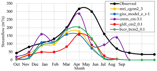 Five GCMs of global climate—gfdl_cm2_1.1, bccr_bcm2_0.1, cnrm_cm3.1, giss_model_e_r.1, and mri_cgcm2_3_2a.1—were used for the Diyala River Basin for future climate projection to 2050 based on the A1B scenario of medium emissions. These are the most popular GCMs and cover all scenarios of future climate change [34].