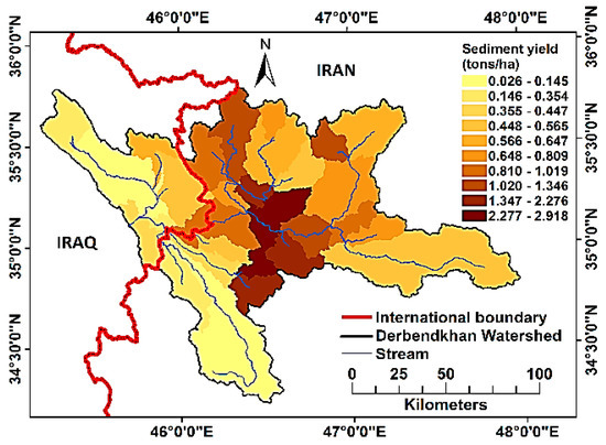 Figure 17 shows the spatial distribution of sediment yield within the Derbendkhan Watershed for the period from 1984 to 2013. This figure shows that the Iraqi part of the watershed contributed only 10% of the total sediment produced by the Derbendkhan Watershed. In addition, a large amount of the sediment was produced by the middle part of the watershed. This is because the middle parts of the Derbendkhan Watershed have steep slopes with pasture land cover that allow the surface streamflow to erode the surface soil. The Iraqi parts of the watershed have mild slopes with frosted and agricultural land cover, so this part contributed to a small amount of sediment reaching the Derbendkhan Reservoir.