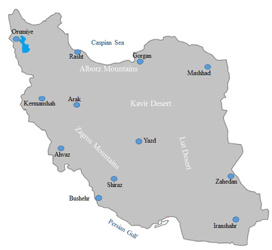 In terms of its physiography, Iran can be divided into four regions: Caspian, Central Plateau (Kavir and Lut deserts), Zagros, and the Southern coastal plain [16]. Iran is located in the arid belt and comprises around 1.6 million km2. More than 50 percent of the land area is mountainous and around 30 percent of the total land area (situated in the central plateau) receives low annual precipitation (50–250 mm). Only the Caspian Plain in the north receives more than 1000 mm per year (Table 1). The average annual potential evaporation is estimated to be more than 4000 mm in the central part of Iran [17].