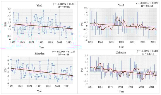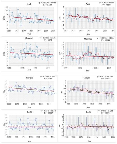 Annual precipitation variability indices (PVI) for the six selected synoptic stations from four different climate types. The dashed red lines (right) show the five-year moving average. The solid red lines (left and right) denote a simple regression analysis. Source: Iranian Meteorological Organization (https://irimo.ir/eng/index.php).