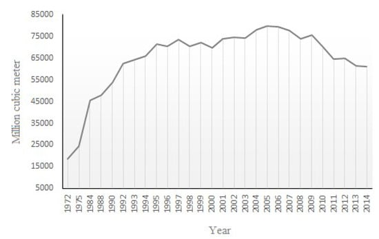 The water shortage worldwide is considered a key threat for the twenty-first century [32]. The issue of water scarcity in Iran is long-term and it has become a chronic environmental problem. Iran has been facing increasingly severe water scarcity, especially in recent decades, mainly in the central part of the country. Inadequate precipitation is the main cause of water scarcity, but anthropogenic drivers, such as rapid population growth and poor water resource management, also play an important role. Approximately 89.5 billion cubic meters per year of fresh water are consumed by human activities in Iran and around 93% of this amount is used for agricultural purposes [33]. Farmlands under irrigation are estimated to comprise around 8 million hectares. Water use for irrigation is supplied from both surface water and groundwater resources, in proportions of 45% and 55%, respectively. Groundwater plays a very important role in Iran’s agricultural operations; every year, an average of approximately 44 billion cubic meters of water is supplied for agricultural purposes from around 363,000 deep (>50 m) and semi-deep (<50 m) wells [33,34]. According to the Iranian Water Resource Management Company [18], the exploitation of groundwater in Iran has increased from around 16,517 million cubic meters in 1972 to about 61,093 million cubic meters in 2014 due to increased human consumption, land use change, and the irrigation of farmland, especially so following the rapid population growth and urbanization that has occurred since 1975 (Figure 3). Therefore, the exploitation usage of groundwater in Iran has been increased around fourfold and the average annual decrease in the groundwater table has been around 0.51 m [34]. The mean yearly decrease in the level of the groundwater table is around 50 cm in central Iran [8]. Therefore, pumping of the groundwater urgently needs to be regulated.