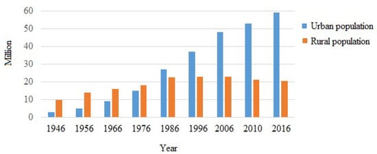 The total land area of Iran is 1.65 million km2 and the population is around 82 million. Population growth and urbanization are the main driving forces of environmental stresses. Since the late 1950s, there has been rapid population growth in Iran. Between 1956 and 2018, the population increased from about 19 million to more than 82 million. The rural population, as a proportion of the total in Iran, is decreasing and the size of the urban area shows growth over the past six decades e.g., [49,50] (Figure 5). Around 21 million people (about 25.6% of the total population) live in rural areas and approximately one-fourth are engaged in agriculture [34]. Economic progress and population growth are the basic and primary driving forces of unsustainable land-use changes and overexploitation of natural resources and subsequent desertification in Iran. As an example, since the 1950s, Iran’s farmland has increased by more than five times and deforestation has also occurred at a significant rate [51].