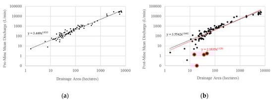 Linear regression analysis indicated a very strong positive relationship existed between the dependence of the mean discharge on the drainage area for both pre-mine (r = 0.978, n = 88, p = 0.013) and post-mine (r = 0.936, n = 88, p = 0.041) datasets, as shown in Figure 2.