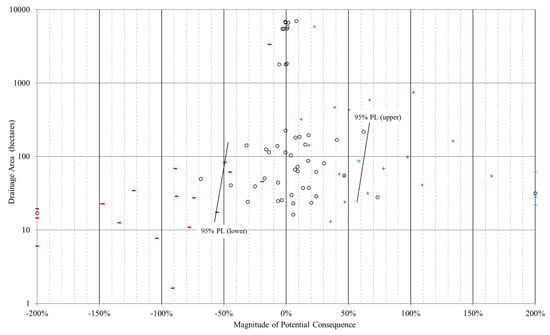 Analyzing the magnitude of hydrologic consequence measured at each sample site as it related to drainage area identified three statistically distinct groupings, as shown in Figure 3: no difference in discharge (ο), an increase in post-mine discharge (+), and a decrease in post-mine discharge (−). The transitions between these groups are conspicuous and were statistically derived as prediction limits using the ordinary least squares (OLS) regression model.