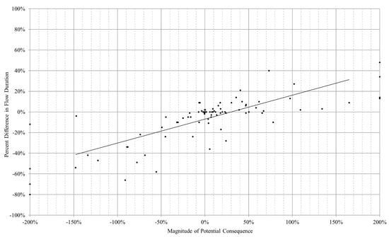 Correlation between the magnitude of potential consequence and difference in flow duration for sample sites in the study area.