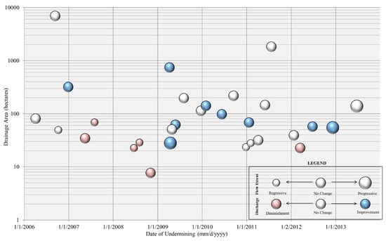 Generally, it is suggested that streams within watersheds smaller than 80 ha experience dewatering longer than streams with greater drainage areas [,]. For this study, it does not appear that streams with watersheds smaller than 80 ha were more susceptible to hydrologic effects of mine subsidence; the difference is posited to be caused by a lack of restoration interventions within the previously studied streams. The streams that exhibited diminished post-mine streamflow conditions in this study (n = 6) are located within watersheds smaller than 80 ha; however, seven streams within watersheds smaller than 80 ha indicated no difference, and five streams indicated improved post-mine streamflow conditions. The streams that exhibited diminished post-mine streamflow conditions did not affect downstream hydrologic conditions, as sample sites located immediately downstream of the confluence between the studied stream and its receiving stream indicated no difference between the pre-mine and post-mine distribution of discharge in all cases for which data were available.
