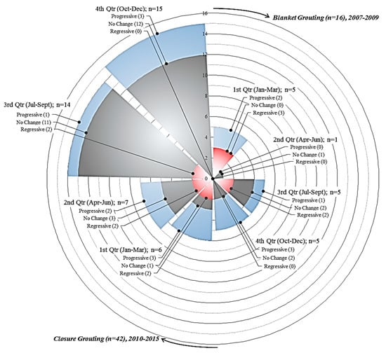 Figure 6 also shows that flow loss restoration is less effective when grouting (blanket or closure-style) is performed in the first quarter (January–March) of the calendar year. Grouting was performed during the first quarter at 11 sample sites, five of which were identified with diminished streamflow conditions. This represents an incidence of 45%. The incidence of sample sites with diminished streamflow conditions when grouting was performed during the second, third, and fourth quarters was 25% (two of eight sample sites), 21% (four of 19 sample sites), and 0% (zero of 20 sample sites), respectively.