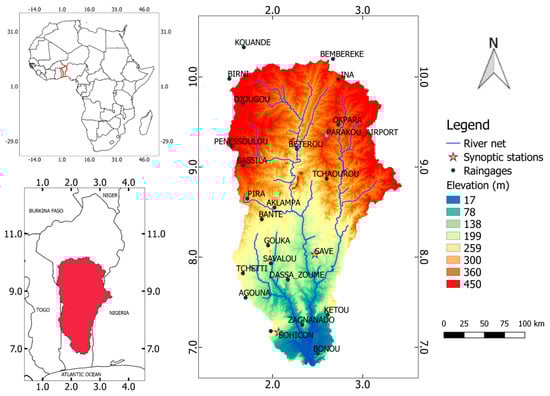 Ouémé catchment area is about 50,000 km2 with 0.1% of this in Togo and 8% in Nigeria [42]. It is under tropical climate with three climate zones from the subequatorial climate to Sudanian climate northward. Ouémé catchment receives annually between 724 and 1396 mm rainfall [43].