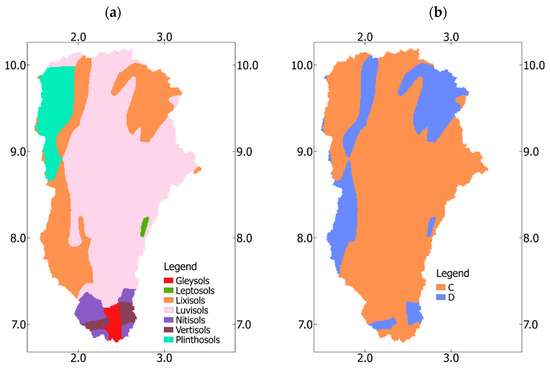 Soil types and hydrological soil groups over Ouémé catchment, based on the Harmonized World Soil Database (HWSD) [44], are shown on Figure 2a,b.
