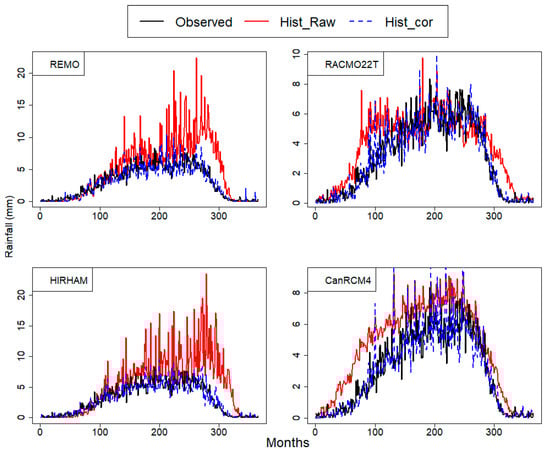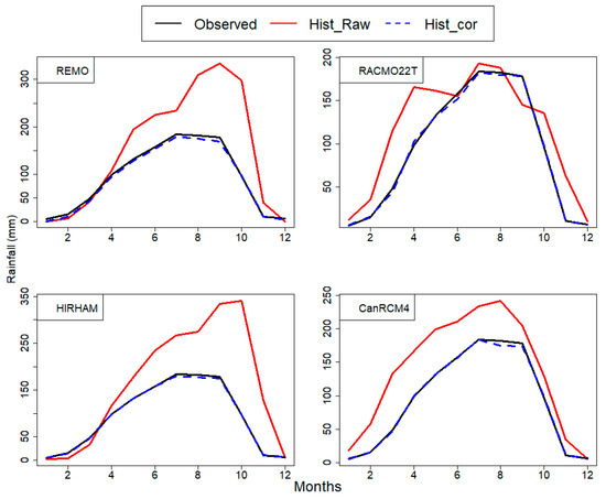 Result of catchment averaged rainfall after bias correction is shown on Figure 5. On graphical basis, seasonal regime of the corrected models fits well that of observations.