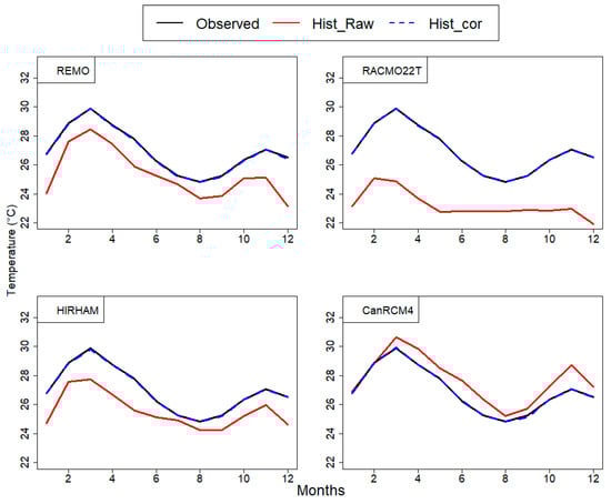 Comparison of raw and bias corrected temperature with observation at seasonal scale over the historical period 1971–2005.