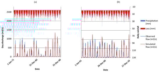 Hydrological model calibration from 1971–1990 (a) and validation over 1991–2010 (b) graphs.