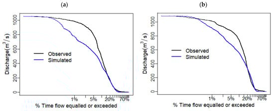 Calibrated and observed flow duration curve is compared according to the flow quantile values. Results are shown respectively in Figure 11a,b. Model performance judgment is based on the five standard classes: high flows (0–10%), moist flows (10–40%), mid-range flows (40–60%), dry conditions (60–90%), and low flows (90–100%).
