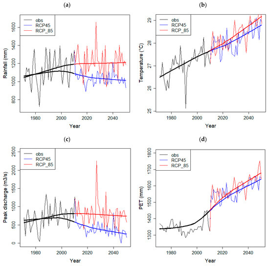 At annual scale, change in annual rainfall, peak discharge, temperature and potential evapotranspiration from observed (1971–2010) to future projection (2020 to 2050) based on the RCP 4.5 and RCP 8.5 are illustrated in Figure 12. On a visual basis, the four variables show an increasing trend during observation period. Considering RCP 4.5 projection, rainfall is projected to decrease, whereas the trend stays constant for RCP 8.5 (Figure 12a). As a result, peak discharge follows rainfall trend as shown in Figure 12c. Moreover, temperature is projected to increase comparing both RCP 4.5 and RCP 8.5 to observation (Figure 12b). Consequently, potential evaporation also shows an increasing trend for both future scenarios (Figure 12d).