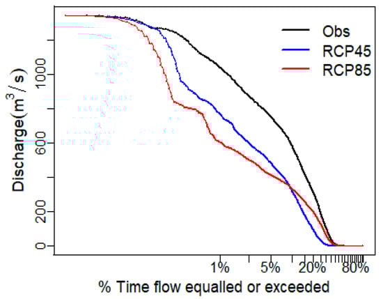 Flow duration curve comparison between observation, RCP 4.5 and RCP 8.5 discharge.