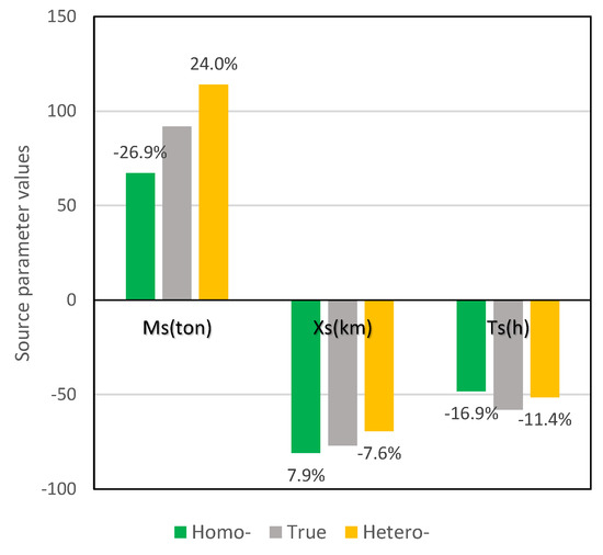 Estimated source parameters are relatively close to real values, and the standard deviations are also relatively small. It demonstrates that the modular-Bayesian approach appropriately succeeded in such a complex real case, despite not being perfect. The results also indicate that the results from the heteroscedastic assumption slightly outweigh the results by homoscedastic assumption (Figure 4). They have the same size of errors on release time inversion, but nevertheless have different sizes for inversion on pollutant load and release time.