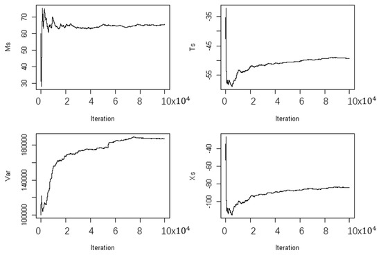 Many approaches have been developed to diagnose the convergence of the Markov chain [37]. The convergence diagnostics developed by Gelman and Rubin and Raftery and Lewis [38,39] are currently the most popular among the statistical community. We use the Gelman–Rubin potential scale reduction factor (R) to diagnose the convergence of the algorithm in this work. See Gelman and Rubin [38] for more details.