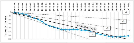 To calculate the p and q coefficients in the above equation, the TSD was first drawn cumulatively (vertical axis) versus time (horizontal axis), and then the best possible line was fit into this graph (Figure 2).