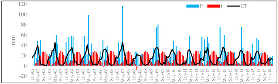 The precipitation, temperature, and evapotranspiration anomalies from 2002 to 2016.