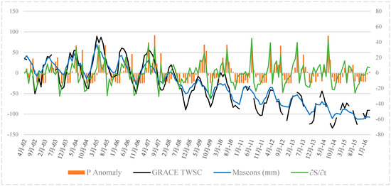 where S is the water storage volume in the earth; P is precipitation; ET is evapotranspiration; and Q is the output runoff from the catchment. The output runoff of this catchment can be determined from the hydrometeorological stations at the desired catchment borders. As it is endorheic, the output water volume of this catchment equals zero. Thus, based on the above equation, the water storage changes in the catchment can be calculated by subtracting the amount of precipitation from evapotranspiration over the desired time interval [14]. Furthermore, we used mascon solutions of the GRACE data [26] to illustrate the time series for the variability in the terrestrial water storage in the studied area and compared it with TWSC results from GRACE [27].
