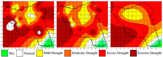 The spatial distribution of drought severity based on SPI, RDIe, and TSDI during 2007–2008 is shown in Figure 7a–c, respectively. The map of the first two indices calculated by discrete data such as temperature and precipitation was plotted using the Kriging method. All three figures show that about 90% of the area suffered from drought with different intensities.