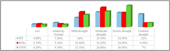 Based on the SPI, a narrow strip of the west and northeast parts and parts of the central area experienced extreme drought while the maps resulting from the RDIe and TSDI showed only the western parts in extreme drought. The southeast parts of the studied area based on all three indices showed the wet condition, normal, mild, and moderate drought, respectively, which had very good conformity. In addition, the central parts experienced severe drought and as we moved toward the northern borders of the area, the drought intensity was reduced and areas with mild and moderate drought were observed. In this part, all three maps were matched to each other. Most areas located in the hyper-arid zone by climatic classification (the southeast areas and small parts of the center) faced less damage due to the drought, which indicated that such areas were more resistant against the occurrence of drought when compared to others. The SPI allocated more areas to extreme drought in comparison to the two other indices due to the lack of attention to the system water need (evapotranspiration) and the full dependency of this index on the precipitation rate. The drought spatial distribution map resulting from the RDIe had a higher correlation to the TSDI. Figure 8 illustrates the percentage of catchment area allocated to different drought intensities based on the indices. The correlation coefficient between the TDSI and RDIe was 83% and was 71% between the TDSI and SPI.