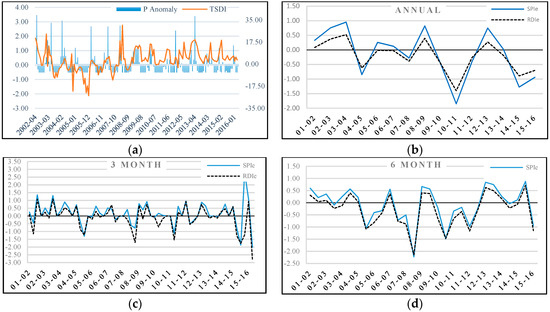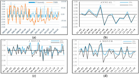 Drought detection and monitoring in the semi-arid zone of the studied area by (a) TSDI; (b) Annual SPI and RDIe; (c) SPI-3 and RDIe-3; (d) SPI-6 and RDIe-6.