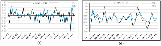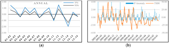 It is worth noting that other droughts were recognized by the SPI and RDIe in this area (Figure 11b), while no signal was observed in the TSDI. For example, a drought that occurred from 2010 to 2011 was evaluated as severe by an annual SPI of −1.85 and as a moderate drought by an annual RDIe of −1.40. The 3-month and 6-month indices indicated this phenomenon as moderate drought. Similarly, it happened in the 3- and 6-month indices.