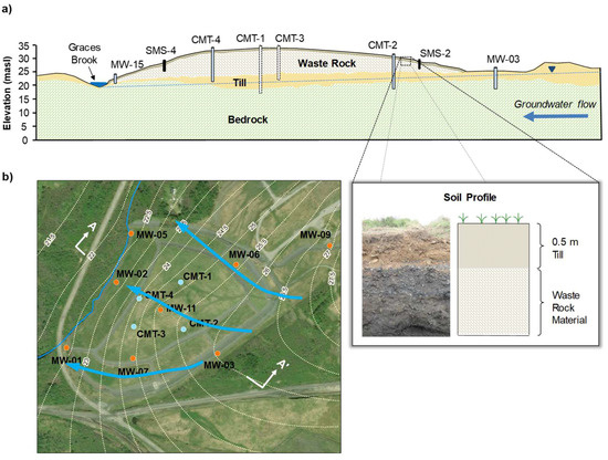 To prevent and/or control the generation of AMD, cover systems are installed over the WRP to isolate the reactive waste from the atmosphere and thereby limit the influx of meteoric water and atmospheric oxygen to the waste rock [9,10]. The design of a cover system is site-specific and dependent on several factors, including site conditions (i.e., climate, hydrogeology, waste rock geochemistry), installation complexity and cost, material availability and site closure objectives [11,12]. As a result, numerous covers exist, ranging from a single-layer of earthen material to multiple layers of different materials such as native soils, organic materials and geosynthetics [12,13,14,15,16].