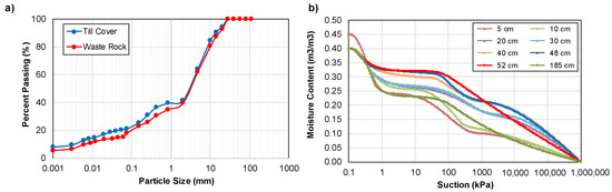 The various materials within the WRP site have been characterized using several methods. Figure 3a,b presents the particle size distribution and moisture retention curves, respectively, for the till material used in the cover and the waste rock material.