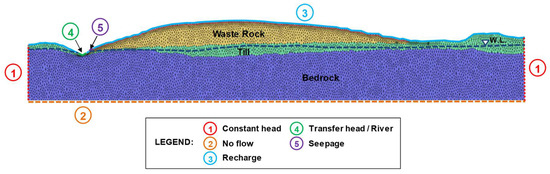 The model domain was discretized into a 2D finite element mesh. The mesh was generated using the algorithm of the Triangle Mesh generator, with the mesh size ranging from 0.5–1.0 m in length. The resulting model domain consisted of 14,474 triangular finite element cells. It was then subdivided vertically into seven layers with variable thicknesses to represent the various geologic units. The 0.5 m thick cover material was modeled by a single layer (Layer 1), while the variably thick waste rock was modeled by four layers (Layers 2 to 5). Layer 6 and Layer 7 were used to represent the till and bedrock, respectively. Table 1 summarizes the various layers in the model domain.